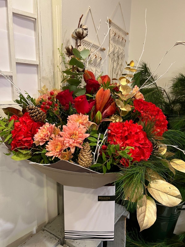 Our classic style will feature blooms in reds, burgundies and greens. Pops of cream and peach. You might see highlights of gold, spruce and pine.